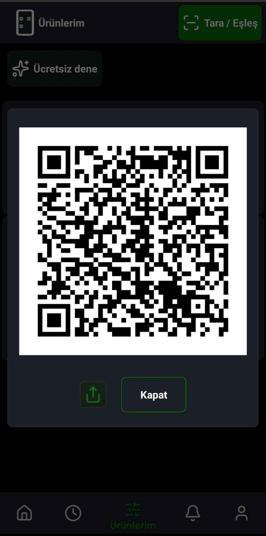 Oluşturulan ürünün sağ üst köşesindeki butona dokunarak size özel QR kodu görüntüleyin.